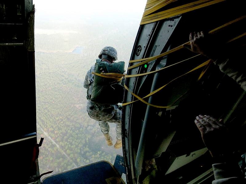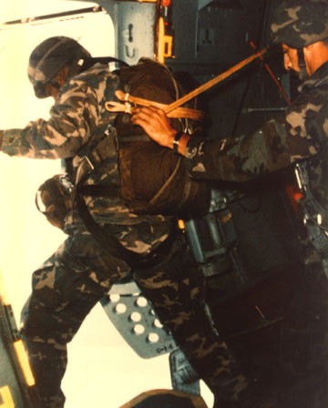 First jump! Jumpmaster gives this trooper the signal to GO. After five qualifying jumps, he will become a member of the world-wide fraternity.